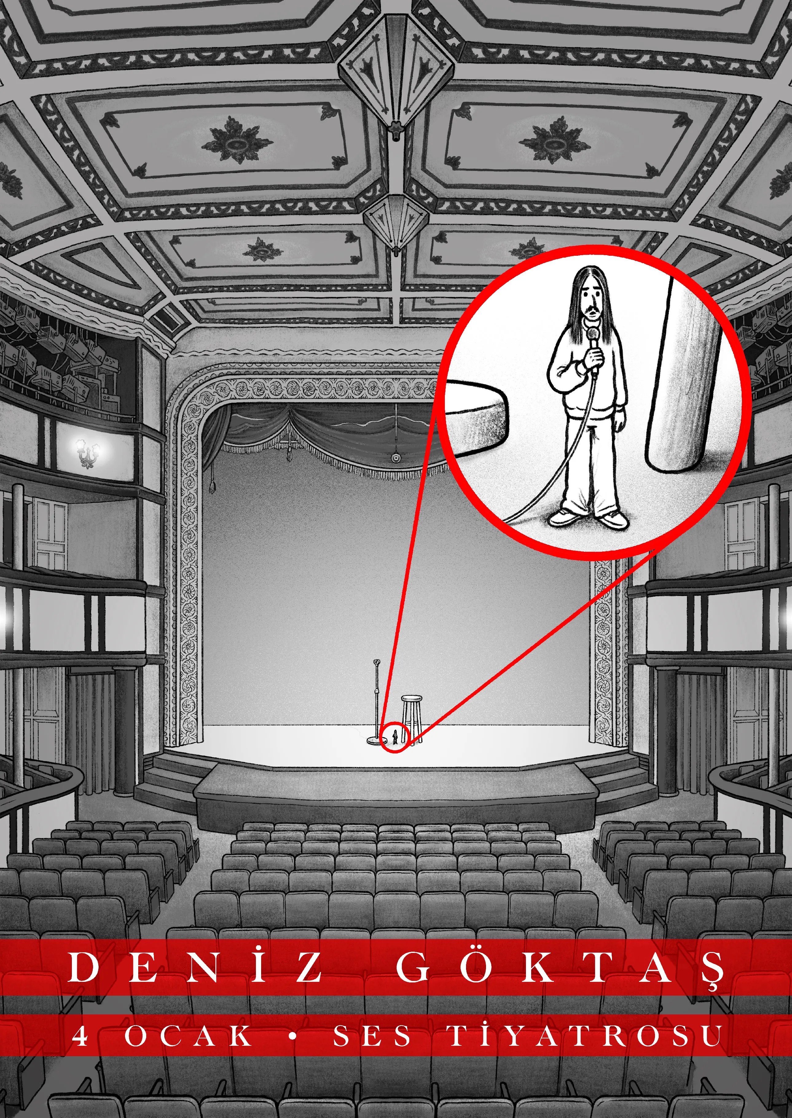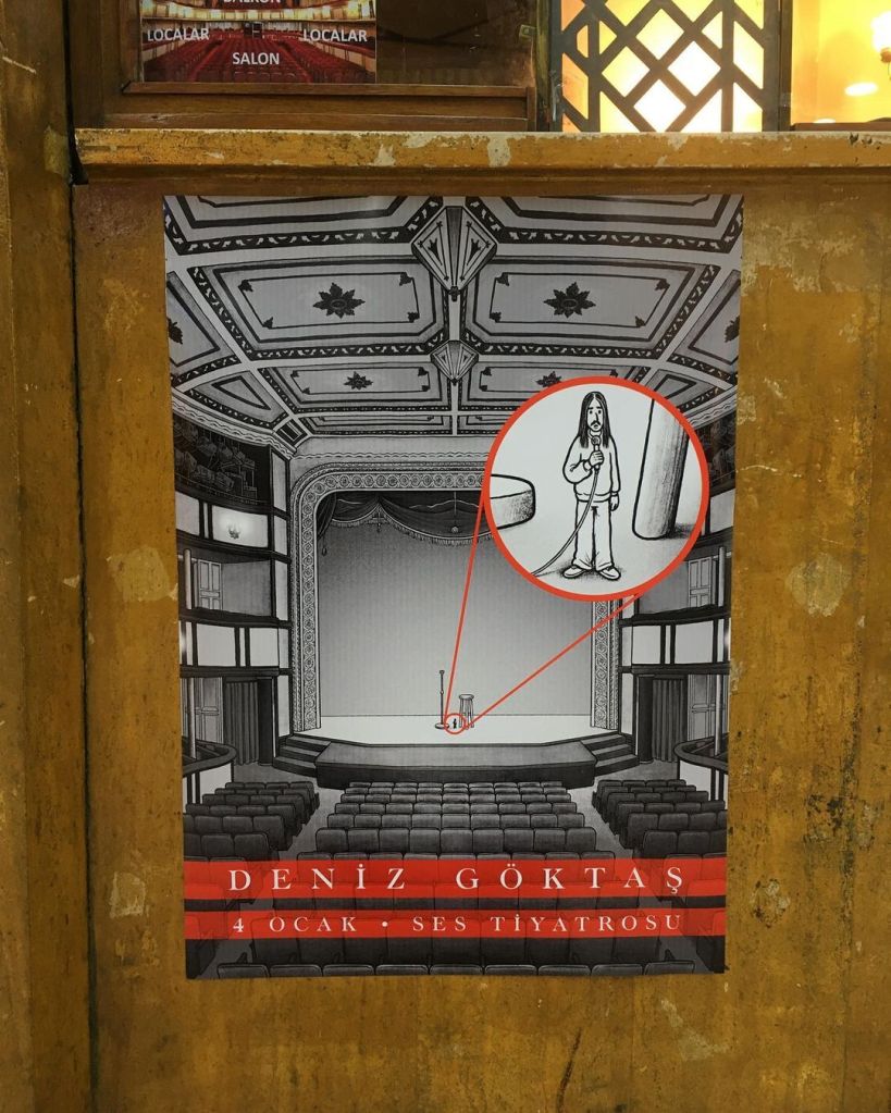 Poster for stand-up show of Deniz Göktas at Ses Theatre, which is an iconic stage in the culture & art history of Beyoglu/Istanbul.